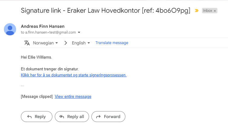 Under ser du et eksempel på hvordan standardmalen for eposten som sendes når advokatkontoret har sendt et dokument til elektronisk signering.