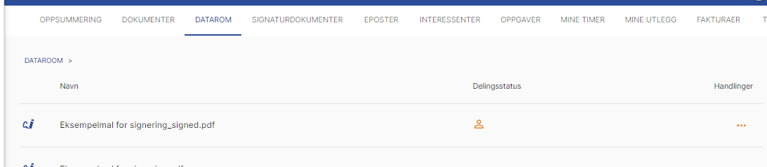 Det signerte dokumentet havner så i Datarommet i Legala. Her kan man sette hvem dokumentet er delt med gjennom Legala sin klientportal. Dokumentet vil automatisk være delt med de som har mottatt signeringslink. Deling kan videre bestemmes fra menyen til høyre i bildet under.